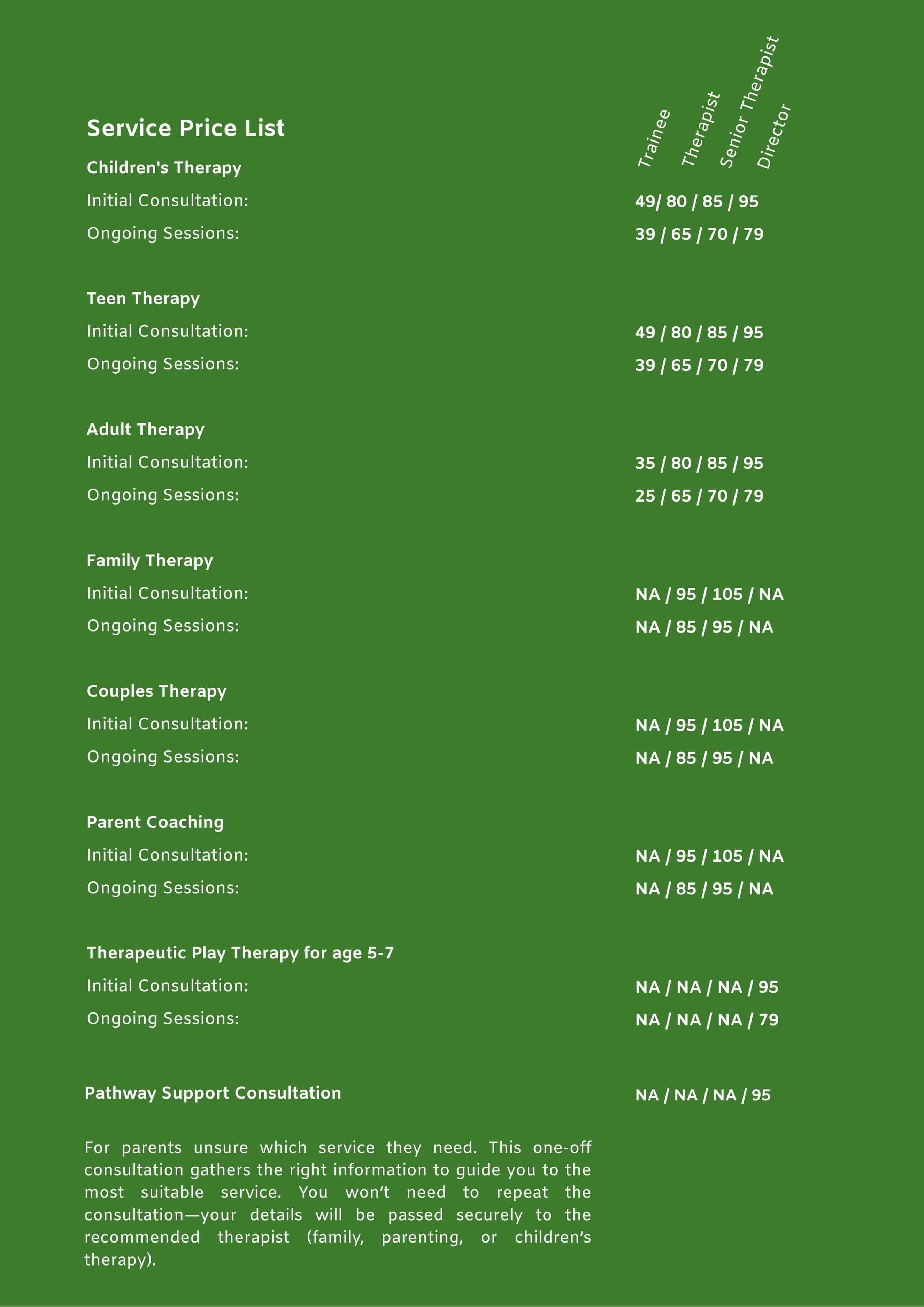Senior Therapists – Highly experienced practitioners with advanced skills, specialist training, and many years of practice.